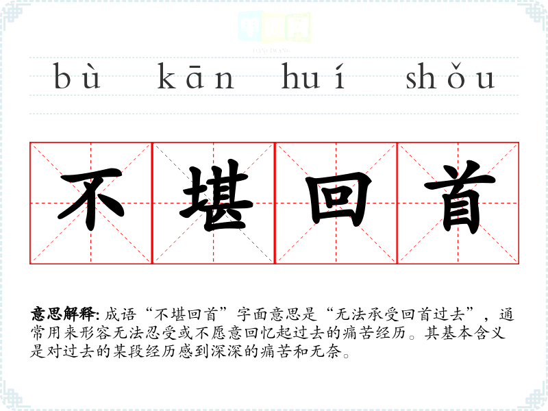 | 不堪回首 | 堪:可以忍受;回首:回顾,回忆。指对过去的事情想起来就会感到痛苦,因而不忍去回忆。 |