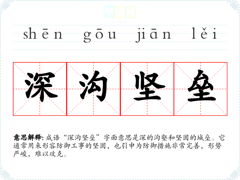 成语“深沟坚垒”字面意思是深的沟壑和坚固的城垒。它通常用来形容防御工事的坚固,也引申为防御措施非常完善,形势严峻,难以攻克。