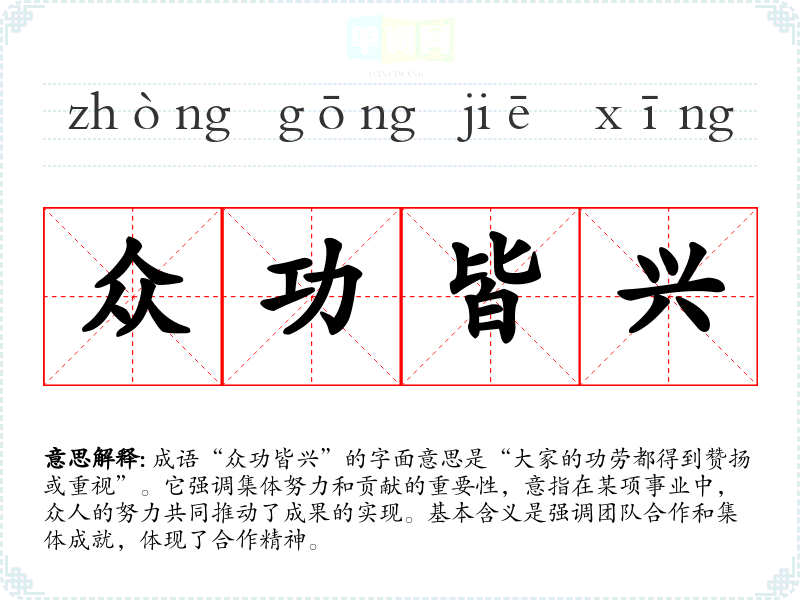 成语“众功皆兴”的字面意思是“大家的功劳都得到赞扬或重视”。它强调集体努力和贡献的重要性,意指在某项事业中,众人的努力共同推动了成果的实现。基本含义是强调团队合作和集体成就,体现了合作精神。