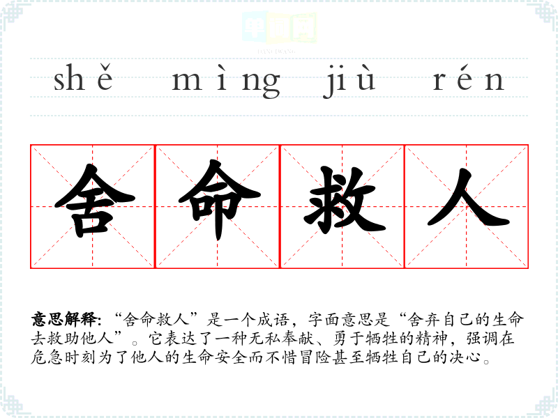 “舍命救人”是一个成语,字面意思是“舍弃自己的生命去救助他人”。它表达了一种无私奉献、勇于牺牲的精神,强调在危急时刻为了他人的生命安全而不惜冒险甚至牺牲自己的决心。