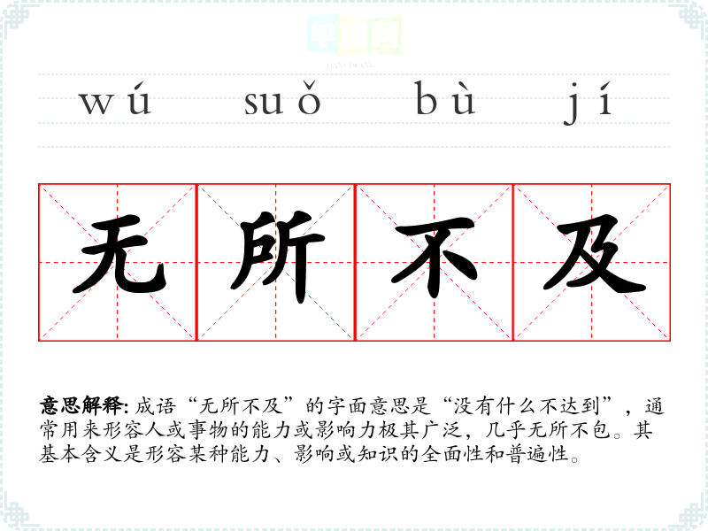 成语“无所不及”的字面意思是“没有什么不达到”,通常用来形容人或事物的能力或影响力极其广泛,几乎无所不包。其基本含义是形容某种能力、影响或知识的全面性和普遍性。