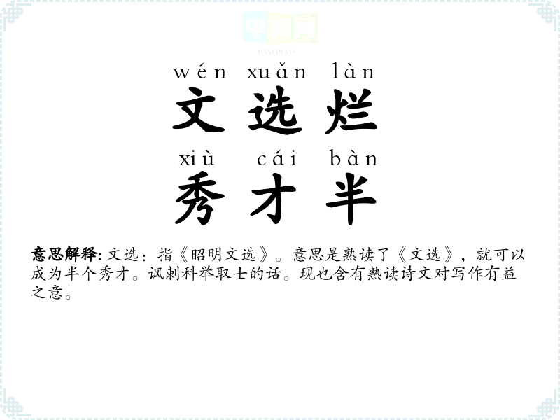 | 文选烂,秀才半 | 文选:指《昭明文选》。意思是熟读了《文选》,就可以成为半个秀才。讽刺科举取士的话。现也含有熟读诗文对写作有益之意。 |