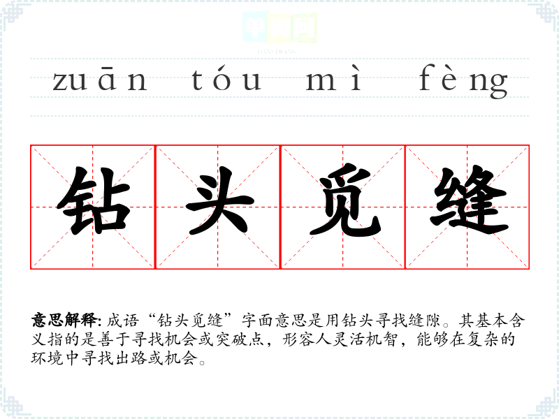 成语“钻头觅缝”字面意思是用钻头寻找缝隙。其基本含义指的是善于寻找机会或突破点,形容人灵活机智,能够在复杂的环境中寻找出路或机会。