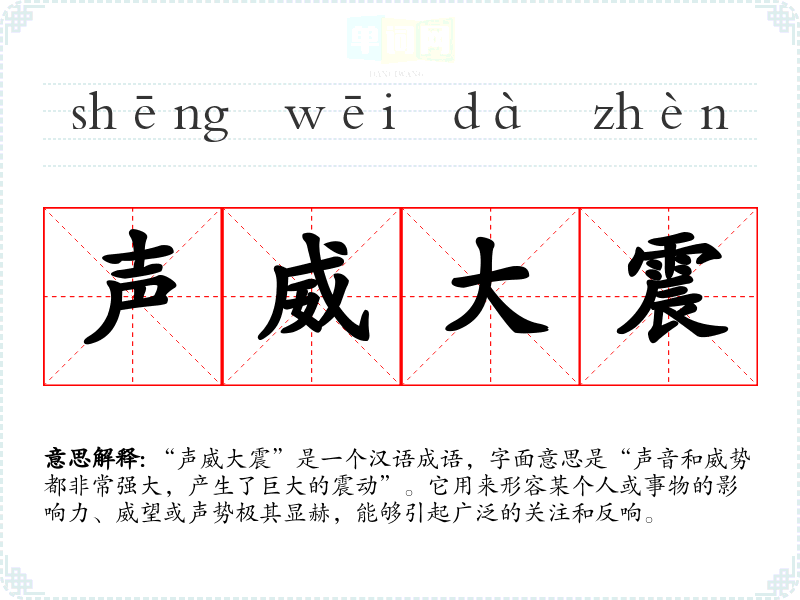 “声威大震”是一个汉语成语,字面意思是“声音和威势都非常强大,产生了巨大的震动”。它用来形容某个人或事物的影响力、威望或声势极其显赫,能够引起广泛的关注和反响。