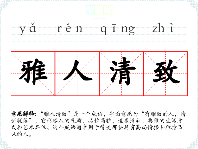 “雅人清致”是一个成语,字面意思为“有雅致的人,清新脱俗”。它形容人的气质、品位高雅,追求清新、典雅的生活方式和艺术品位。这个成语通常用于赞美那些具有高尚情操和独特品味的人。