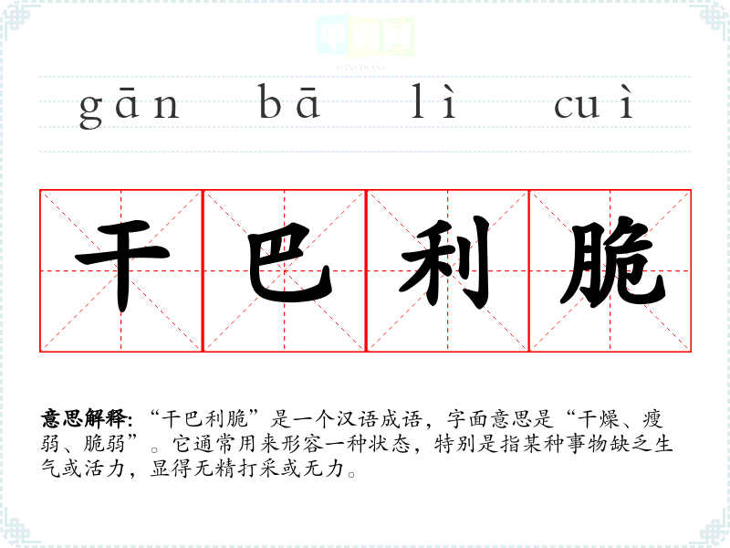 “干巴利脆”是一个汉语成语,字面意思是“干燥、瘦弱、脆弱”。它通常用来形容一种状态,特别是指某种事物缺乏生气或活力,显得无精打采或无力。
