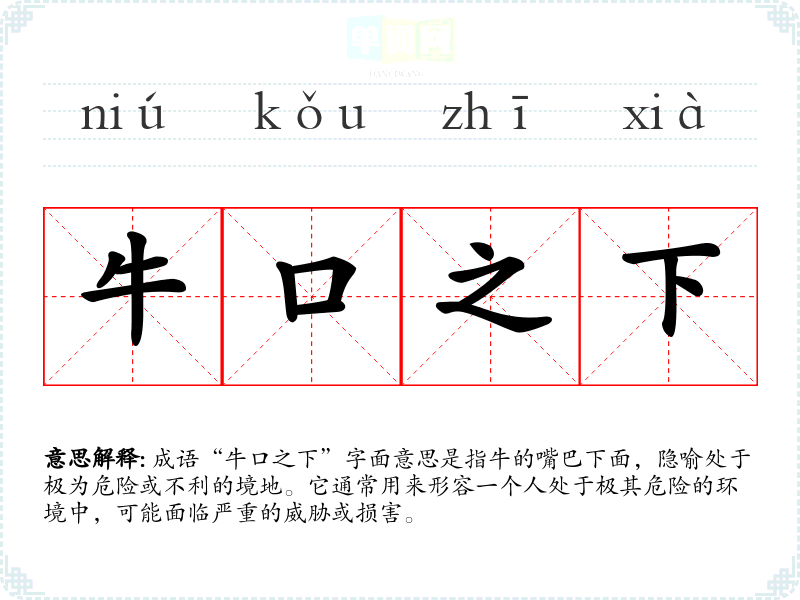 成语“牛口之下”字面意思是指牛的嘴巴下面,隐喻处于极为危险或不利的境地。它通常用来形容一个人处于极其危险的环境中,可能面临严重的威胁或损害。