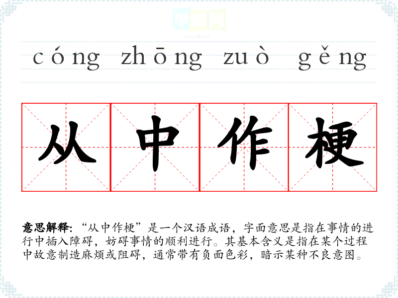 “从中作梗”是一个汉语成语,字面意思是指在事情的进行中插入障碍,妨碍事情的顺利进行。其基本含义是指在某个过程中故意制造麻烦或阻碍,通常带有负面色彩,暗示某种不良意图。