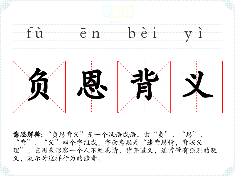 “负恩背义”是一个汉语成语,由“负”、“恩”、“背”、“义”四个字组成。字面意思是“违背恩情,背叛义理”。它用来形容一个人不顾恩情、背弃道义,通常带有强烈的贬义,表示对这样行为的谴责。
