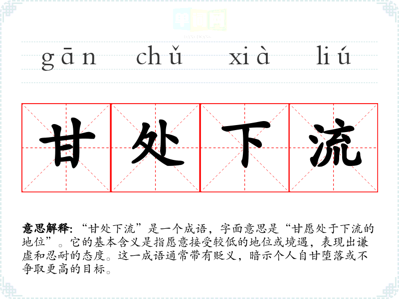 “甘处下流”是一个成语,字面意思是“甘愿处于下流的地位”。它的基本含义是指愿意接受较低的地位或境遇,表现出谦虚和忍耐的态度。这一成语通常带有贬义,暗示个人自甘堕落或不争取更高的目标。