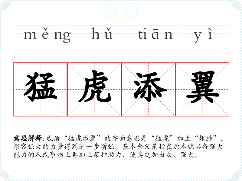 成语“猛虎添翼”的字面意思是“猛虎”加上“翅膀”,形容强大的力量得到进一步增强。基本含义是指在原本就具备强大能力的人或事物上再加上某种助力,使其更加出众、强大。