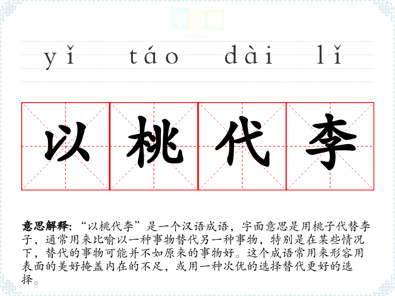 “以桃代李”是一个汉语成语,字面意思是用桃子代替李子,通常用来比喻以一种事物替代另一种事物,特别是在某些情况下,替代的事物可能并不如原来的事物好。这个成语常用来形容用表面的美好掩盖内在的不足,或用一种次优的选择替代更好的选择。