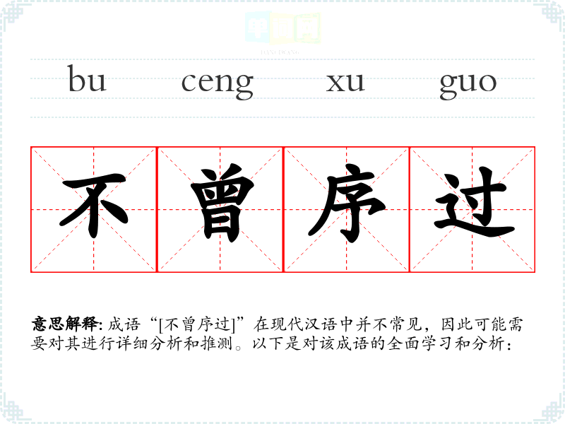 成语“[不曾序过]”在现代汉语中并不常见,因此可能需要对其进行详细分析和推测。以下是对该成语的全面学*和分析: