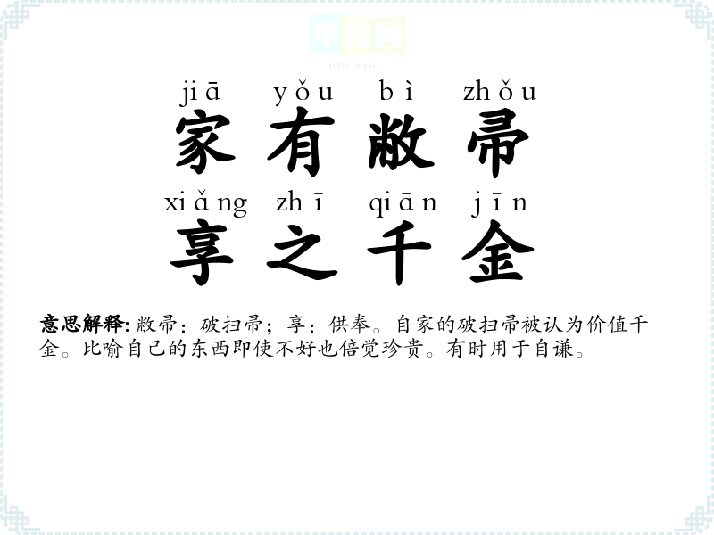 | 家有敝帚,享之千金 | 敝帚:破扫帚;享:供奉。自家的破扫帚被认为价值千金。比喻自己的东西即使不好也倍觉珍贵。有时用于自谦。 |
