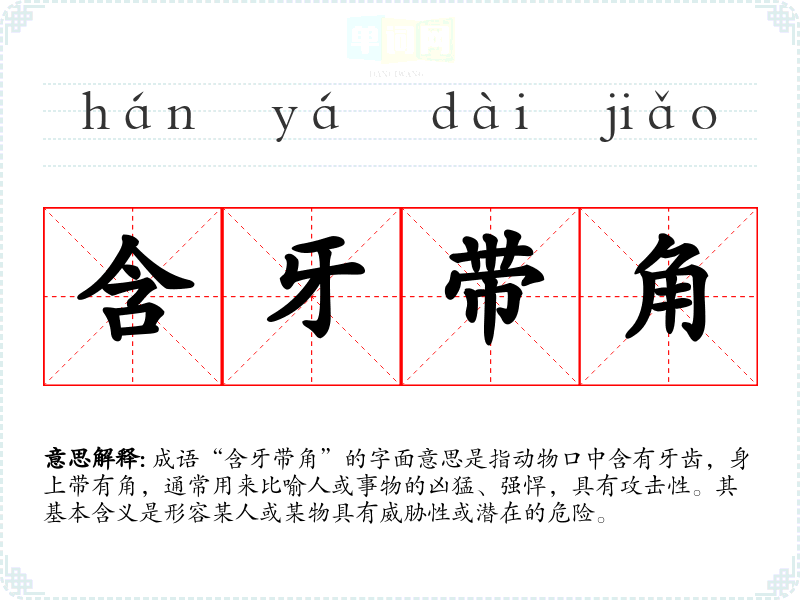 成语“含牙带角”的字面意思是指动物口中含有牙齿,身上带有角,通常用来比喻人或事物的凶猛、强悍,具有攻击性。其基本含义是形容某人或某物具有威胁性或潜在的危险。