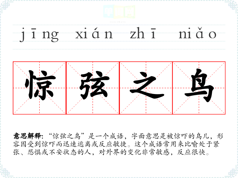 “惊弦之鸟”是一个成语,字面意思是被惊吓的鸟儿,形容因受到惊吓而迅速逃离或反应敏捷。这个成语常用来比喻处于紧张、恐惧或不安状态的人,对外界的变化非常敏感,反应很快。