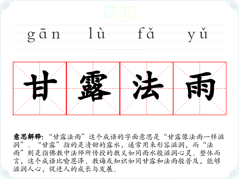 在**传统文化中,甘露象征着恩泽与福气,而法雨则是对人们精神上的滋养。在现代社会中,这个成语依然适用,尤其在教育、心理辅导和人际关系中,强调了关怀、爱和支持的重要性。它反映了社会对知识传播和人际关系建立的重视。