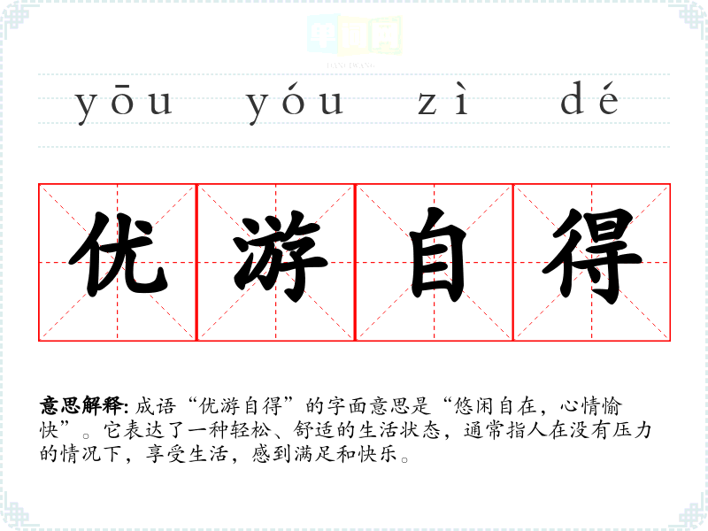 成语“优游自得”的字面意思是“悠闲自在,心情愉快”。它表达了一种轻松、舒适的生活状态,通常指人在没有压力的情况下,享受生活,感到满足和快乐。