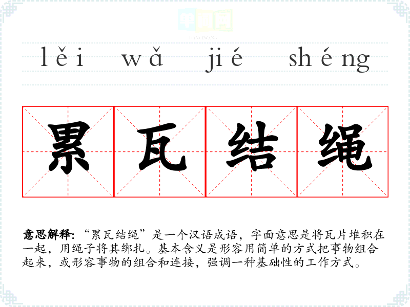 “累瓦结绳”是一个汉语成语,字面意思是将瓦片堆积在一起,用绳子将其绑扎。基本含义是形容用简单的方式把事物组合起来,或形容事物的组合和连接,强调一种基础性的工作方式。