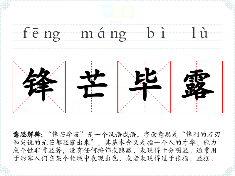 “锋芒毕露”是一个汉语成语,字面意思是“锋利的刀刃和尖锐的光芒都显露出来”。其基本含义是指一个人的才华、能力或个性非常显著,没有任何掩饰或隐藏,表现得十分明显。通常用于形容人们在某个领域中表现出色,或者表现得过于张扬、显摆。