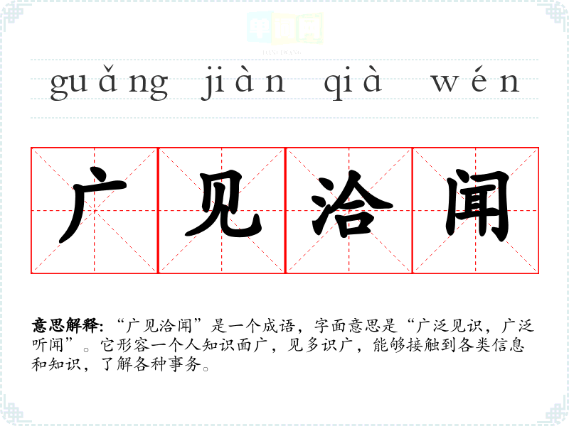 “广见洽闻”是一个成语,字面意思是“广泛见识,广泛听闻”。它形容一个人知识面广,见多识广,能够接触到各类信息和知识,了解各种事务。