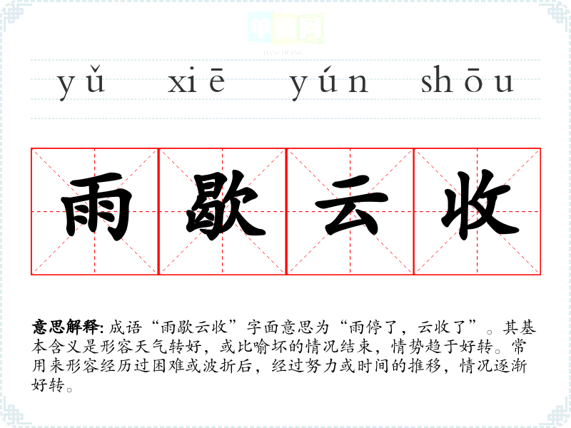 成语“雨歇云收”字面意思为“雨停了,云收了”。其基本含义是形容天气转好,或比喻坏的情况结束,情势趋于好转。常用来形容经历过困难或波折后,经过努力或时间的推移,情况逐渐好转。