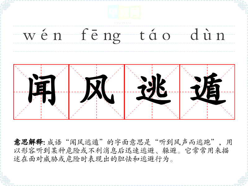 成语“闻风逃遁”的字面意思是“听到风声而逃跑”,用以形容听到某种危险或不利消息后迅速逃避、躲避。它常常用来描述在面对威胁或危险时表现出的胆怯和逃避行为。