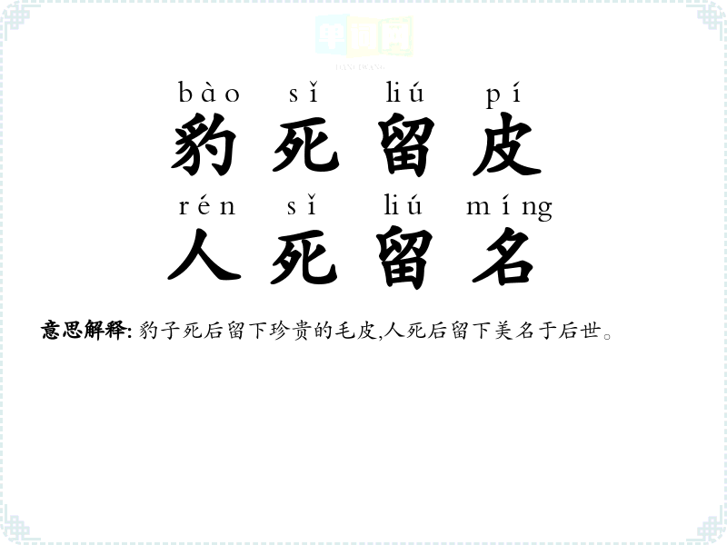 | 豹死留皮 | 豹子死了,皮留在世间。比喻将好名声留传于后世。 |