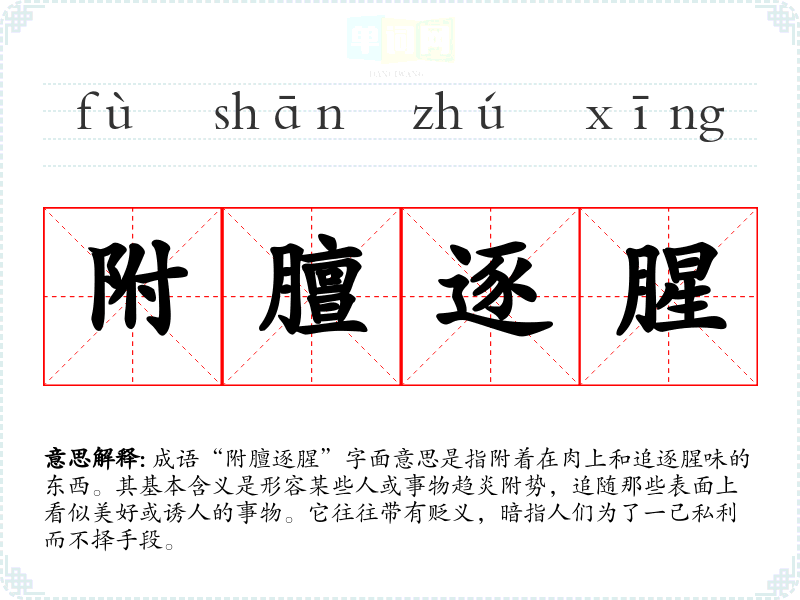 成语“附膻逐腥”字面意思是指附着在肉上和追逐腥味的东西。其基本含义是形容某些人或事物趋炎附势,追随那些表面上看似美好或诱人的事物。它往往带有贬义,暗指人们为了一己私利而不择手段。