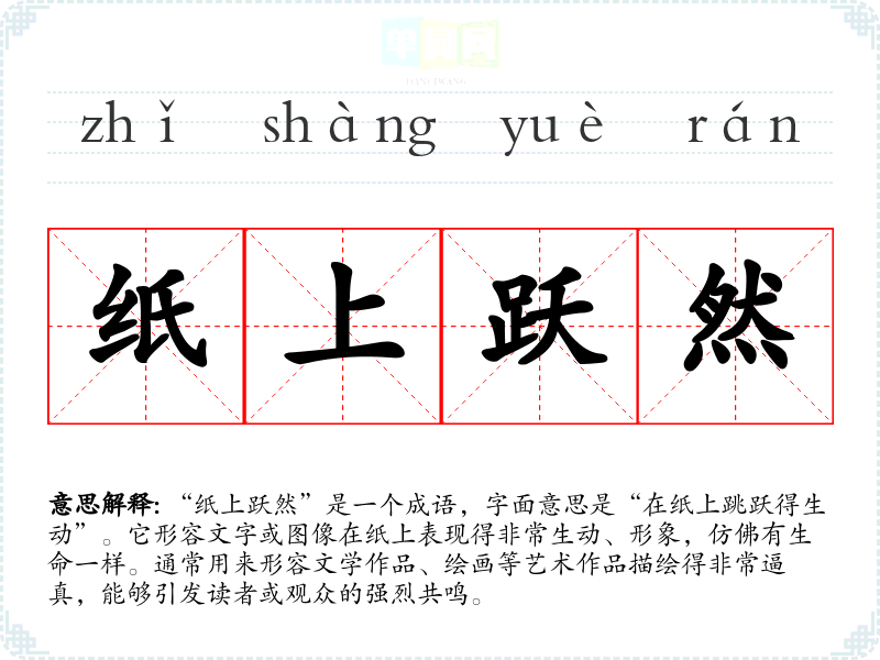 | 纸上跃然 | 跃然:生动形象地呈现。生动形象地呈现在纸上。形容文学作品叙述描写真实生动。 |