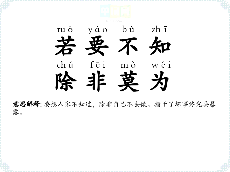| 一不做,二不休 | 原意是要么不做,做了就索兴做到底。指事情既然做了开头,就索兴做到底。 |