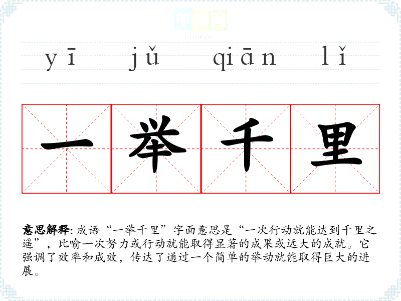 成语“一举千里”字面意思是“一次行动就能达到千里之遥”,比喻一次努力或行动就能取得显著的成果或远大的成就。它强调了效率和成效,传达了通过一个简单的举动就能取得巨大的进展。