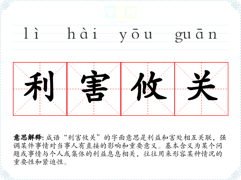 成语“利害攸关”的字面意思是利益和害处相互关联,强调某件事情对当事人有直接的影响和重要意义。基本含义为某个问题或事情与个人或集体的利益息息相关,往往用来形容某种情况的重要性和紧迫性。