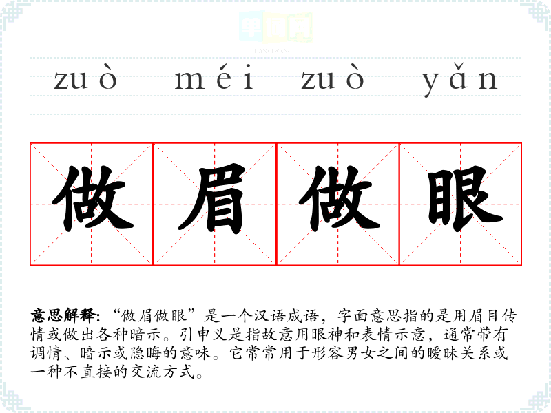 “做眉做眼”是一个汉语成语,字面意思指的是用眉目传情或做出各种暗示。引申义是指故意用眼神和表情示意,通常带有调情、暗示或隐晦的意味。它常常用于形容男女之间的暧昧关系或一种不直接的交流方式。