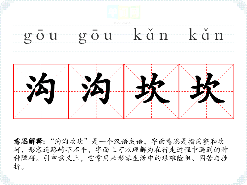 “沟沟坎坎”是一个汉语成语,字面意思是指沟壑和坎坷,形容道路崎岖不平,字面上可以理解为在行走过程中遇到的种种障碍。引申意义上,它常用来形容生活中的艰难险阻、困苦与挫折。