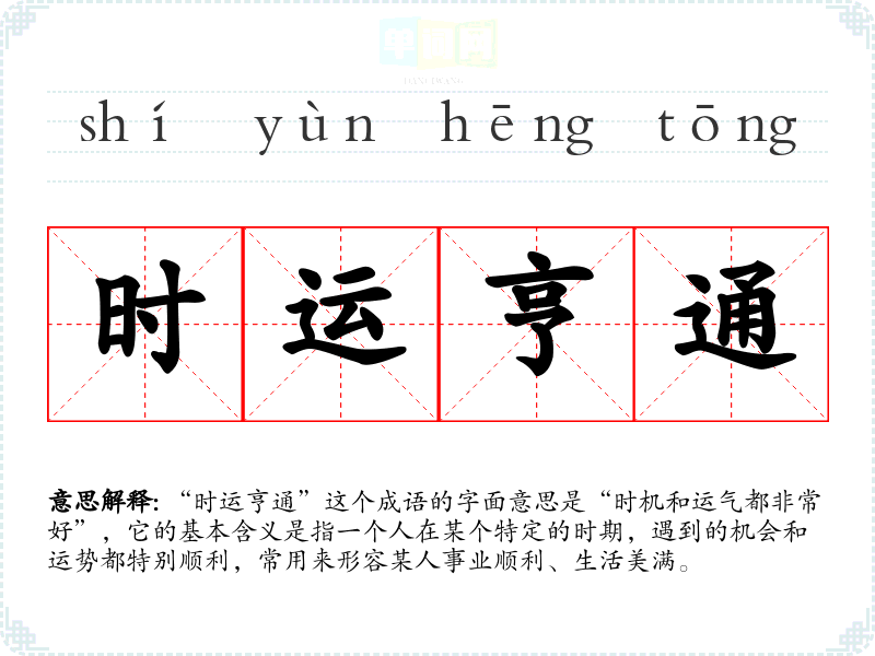 “时运亨通”这个成语的字面意思是“时机和运气都非常好”,它的基本含义是指一个人在某个特定的时期,遇到的机会和运势都特别顺利,常用来形容某人事业顺利、生活美满。