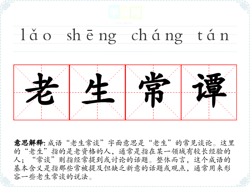 成语“老生常谈”字面意思是“老生”的常见谈论。这里的“老生”指的是老资格的人,通常是指在某一领域有较长经验的人;“常谈”则指经常提到或讨论的话题。整体而言,这个成语的基本含义是指那些常被提及但缺乏新意的话题或观点,通常用来形容一些老生常谈的说法。