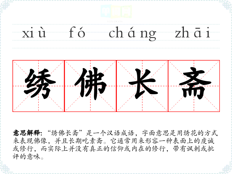 “绣佛长斋”是一个汉语成语,字面意思是用绣花的方式来表现佛像,并且长期吃素斋。它通常用来形容一种表面上的虔诚或修行,而实际上并没有真正的信仰或内在的修行,带有讽刺或批评的意味。