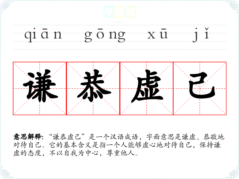 “谦恭虚己”是一个汉语成语,字面意思是谦虚、恭敬地对待自己。它的基本含义是指一个人能够虚心地对待自己,保持谦虚的态度,不以自我为中心,尊重他人。