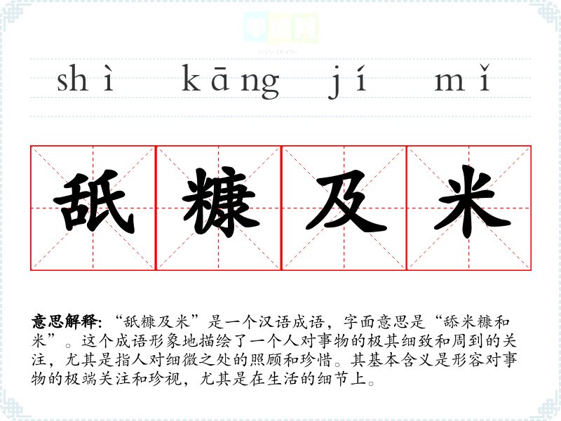 “舐糠及米”是一个汉语成语,字面意思是“舔米糠和米”。这个成语形象地描绘了一个人对事物的极其细致和周到的关注,尤其是指人对细微之处的照顾和珍惜。其基本含义是形容对事物的极端关注和珍视,尤其是在生活的细节上。