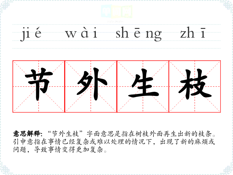 “节外生枝”字面意思是指在树枝外面再生出新的枝条。引申意指在事情已经复杂或难以处理的情况下,出现了新的麻烦或问题,导致事情变得更加复杂。