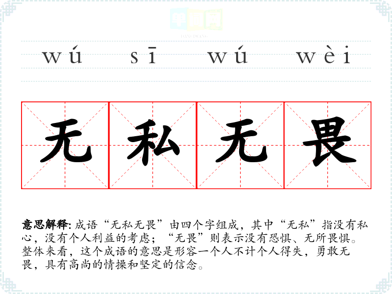 成语“无私无畏”由四个字组成,其中“无私”指没有私心,没有个人利益的考虑;“无畏”则表示没有恐惧、无所畏惧。整体来看,这个成语的意思是形容一个人不计个人得失,勇敢无畏,具有高尚的情操和坚定的信念。