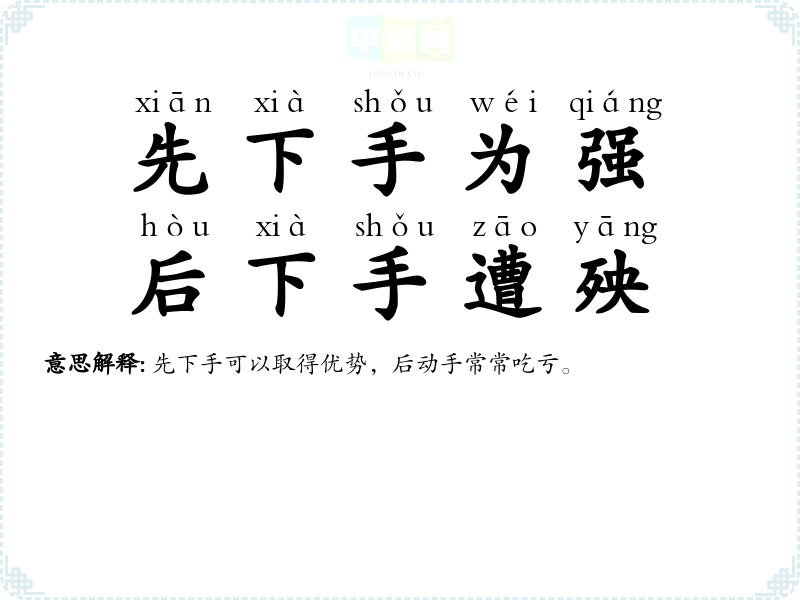 | 先下手为强,后下手遭殃 | 先下手可以取得优势,后动手常常吃亏。 |