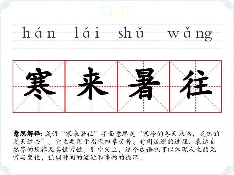 成语“寒来暑往”字面意思是“寒冷的冬天来临,炎热的夏天过去”。它主要用于指代四季交替、时间流逝的过程,表达自然界的规律及其恒常性。引申义上,这个成语也可以体现人生的无常与变化,强调时间的流逝和事物的循环。