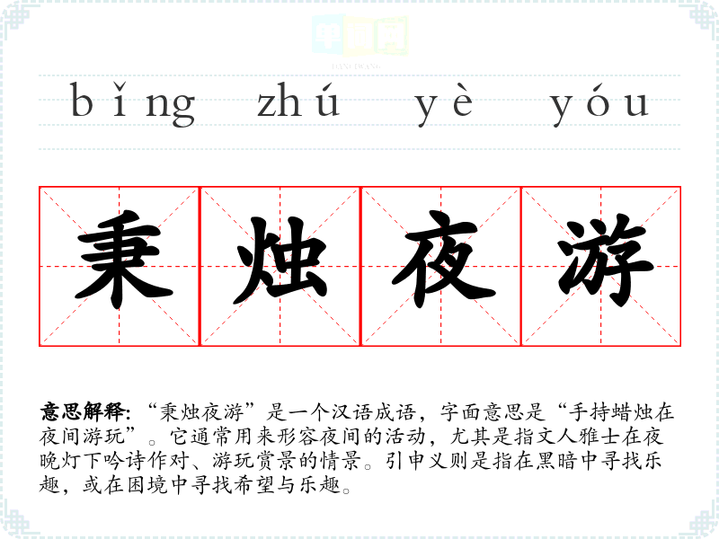 “秉烛夜游”是一个汉语成语,字面意思是“手持蜡烛在夜间游玩”。它通常用来形容夜间的活动,尤其是指文人雅士在夜晚灯下吟诗作对、游玩赏景的情景。引申义则是指在黑暗中寻找乐趣,或在困境中寻找希望与乐趣。