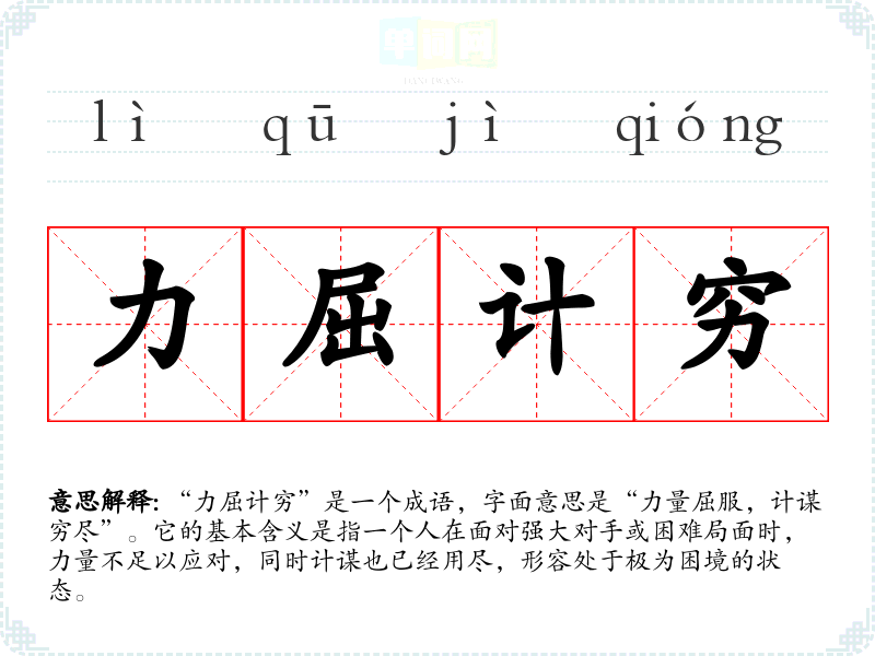 “力屈计穷”是一个成语,字面意思是“力量屈服,计谋穷尽”。它的基本含义是指一个人在面对强大对手或困难局面时,力量不足以应对,同时计谋也已经用尽,形容处于极为困境的状态。