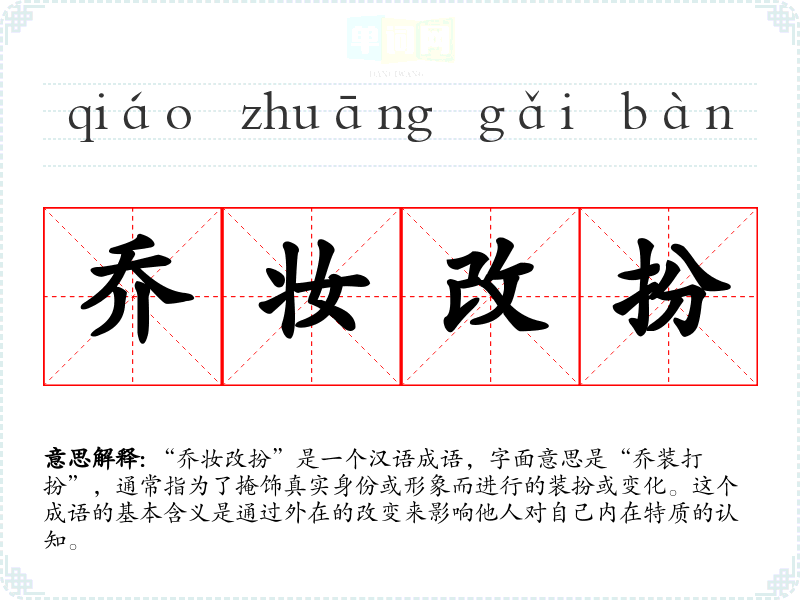 “乔妆改扮”是一个汉语成语,字面意思是“乔装打扮”,通常指为了掩饰真实身份或形象而进行的装扮或变化。这个成语的基本含义是通过外在的改变来影响他人对自己内在特质的认知。