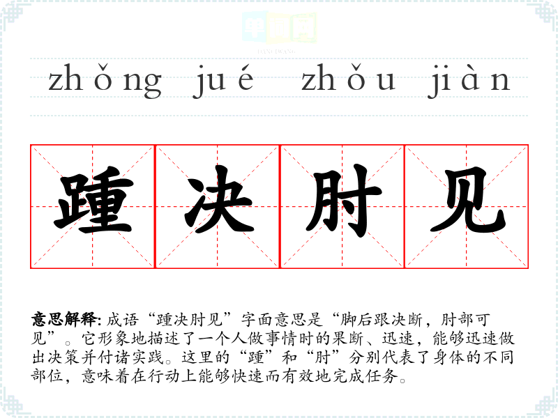 成语“踵决肘见”字面意思是“脚后跟决断,肘部可见”。它形象地描述了一个人做事情时的果断、迅速,能够迅速做出决策并付诸实践。这里的“踵”和“肘”分别代表了身体的不同部位,意味着在行动上能够快速而有效地完成任务。