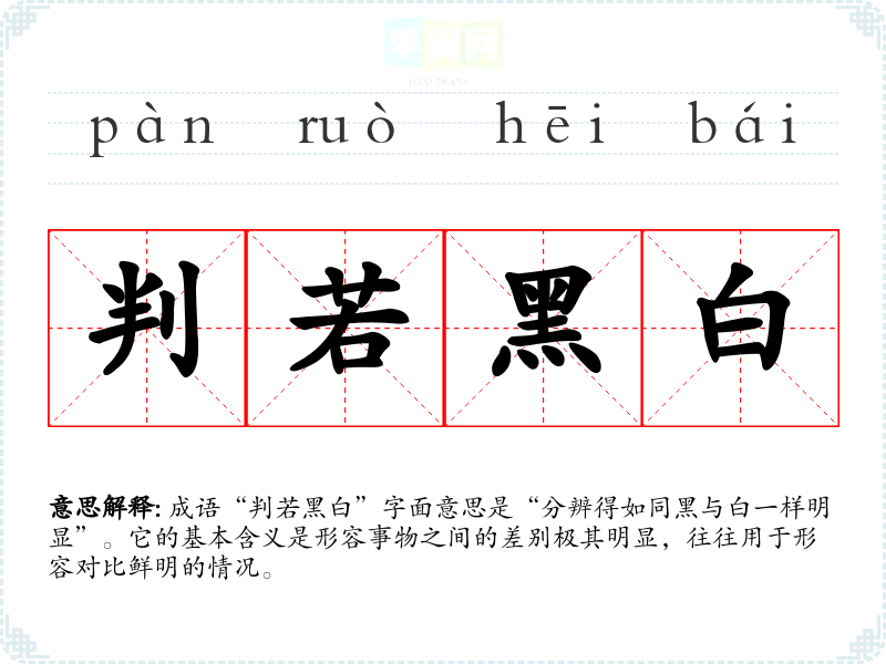 成语“判若黑白”字面意思是“分辨得如同黑与白一样明显”。它的基本含义是形容事物之间的差别极其明显,往往用于形容对比鲜明的情况。