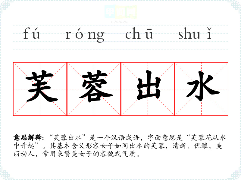 该成语源于古代诗词,最早见于唐代诗人王维的《相思》。在这首诗中,诗人通过描写芙蓉花与水的关系,表现对美好事物的向往和赞美。芙蓉花生长在水边,给人一种清新脱俗的感觉,因此该成语也逐渐被引申为形容女性的清丽。